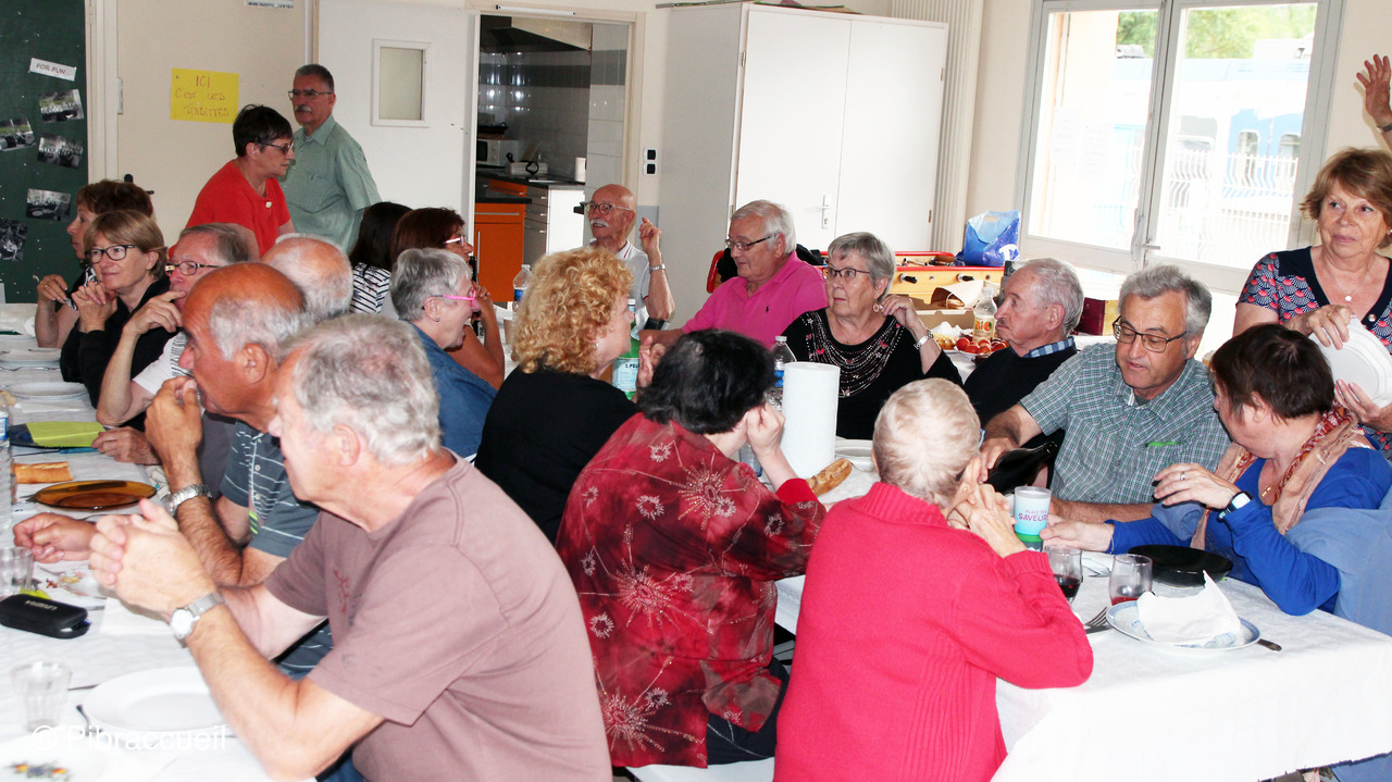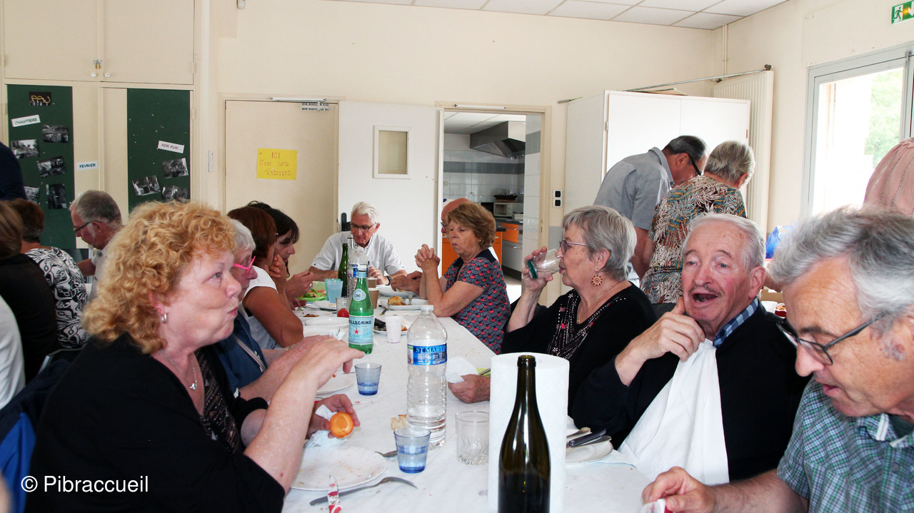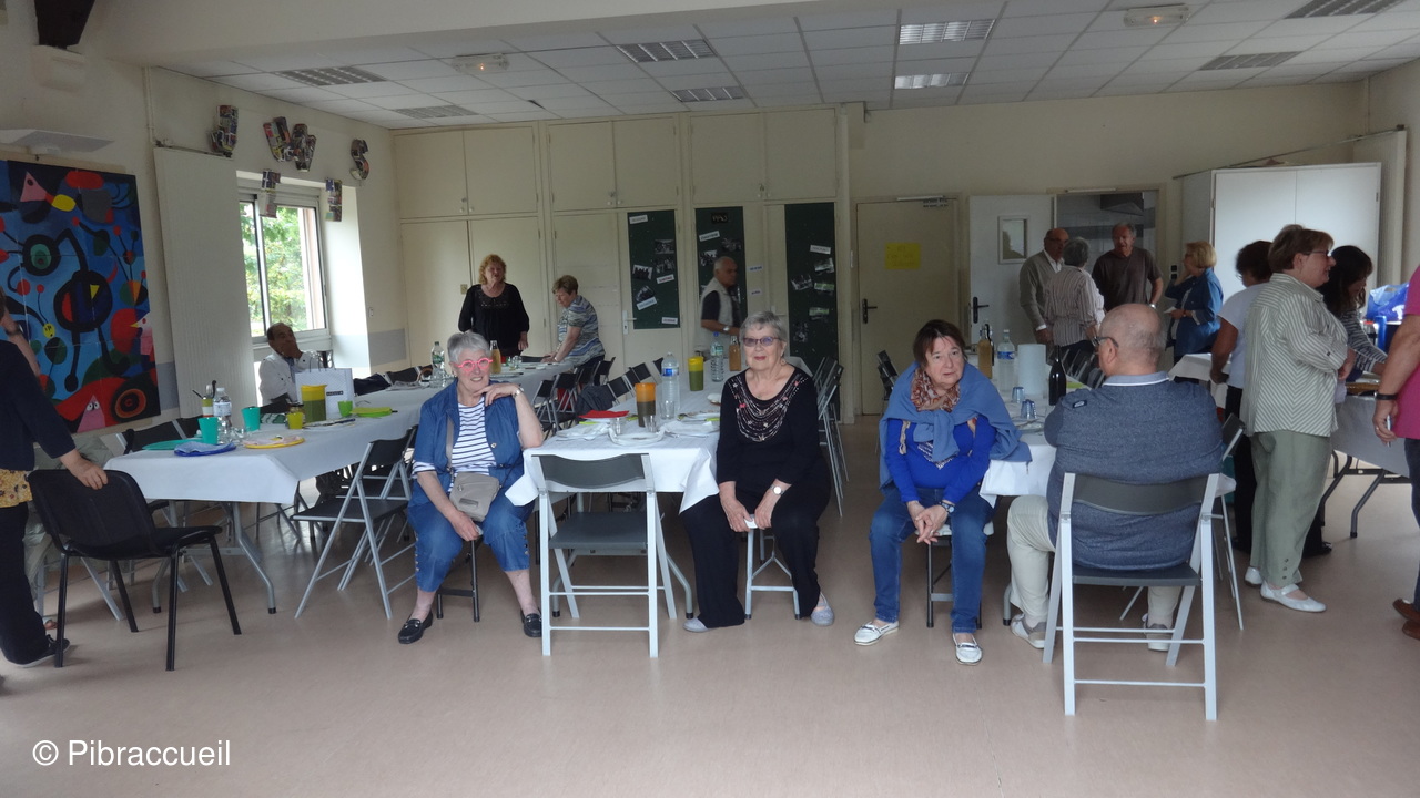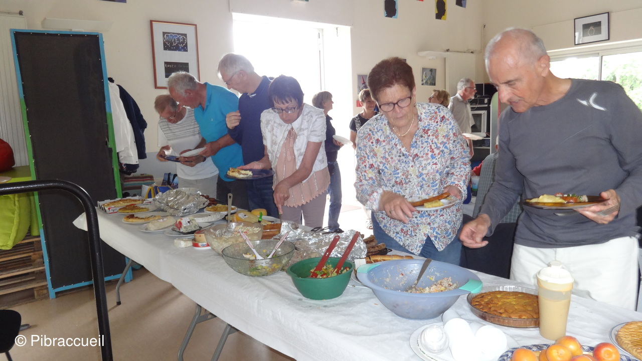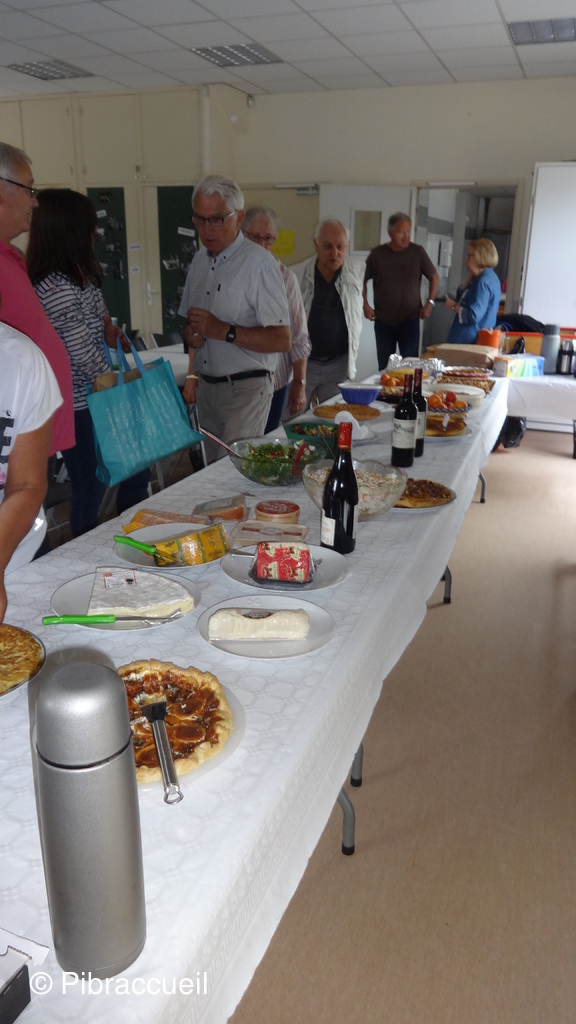 Une invasion de chenilles à la forêt de Bouconne, nous a fait changer de tactique pour notre repas champêtre annuel qui n'en était plus un, puisque nous avons pique-niqué salle du quai à Pibrac. L'apéritif s'est passé dehors sur la terrasse et le repas à l'intérieur pour déguster les préparations de chacun des adhérents. L'apéritif, et autres boissons, les saucisses et chorizos sont offerts par Pibraccueuil. Saucisses et chorizos, préparés à l'avance, et grillés par G. Delous .