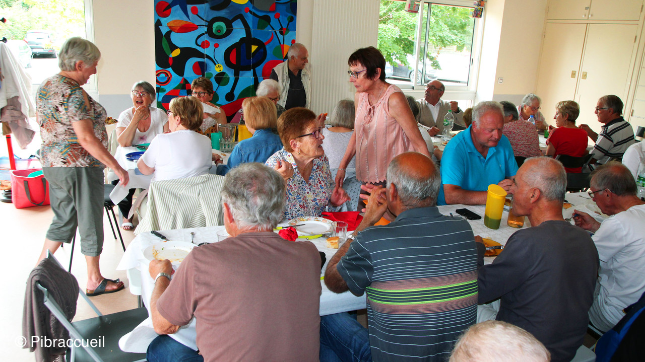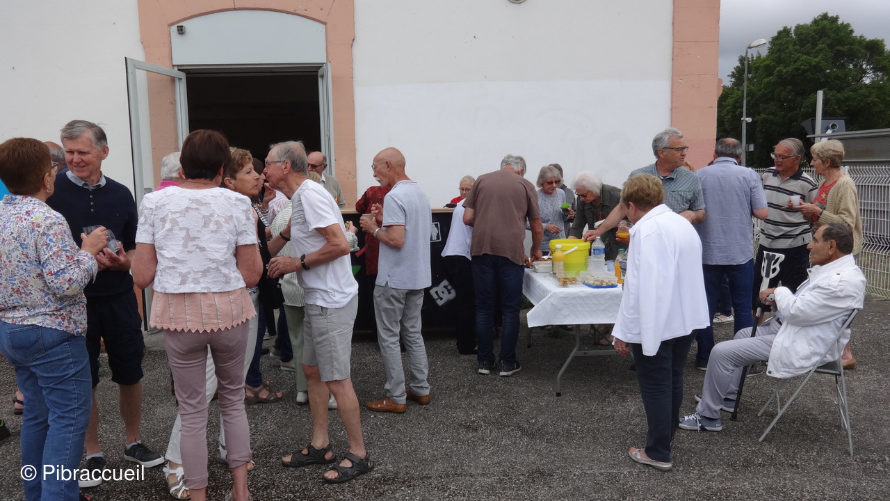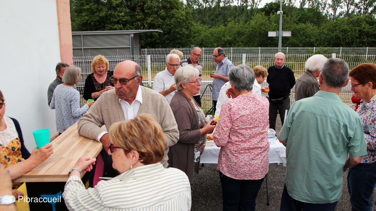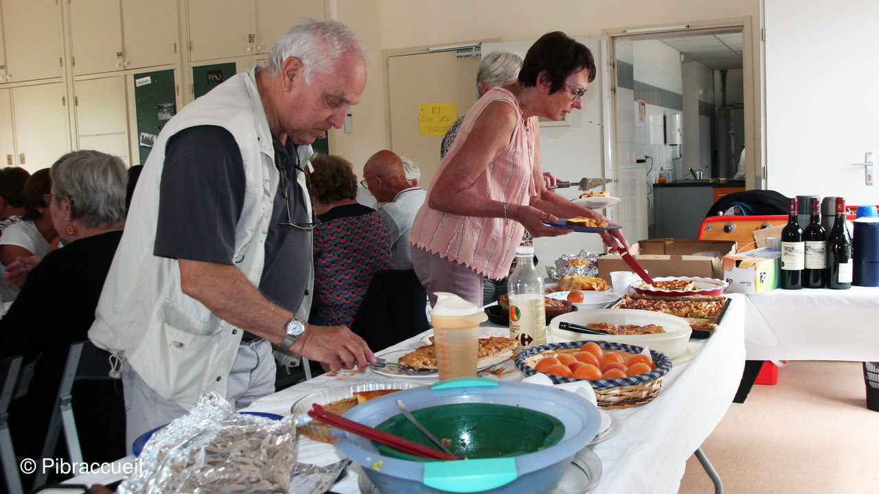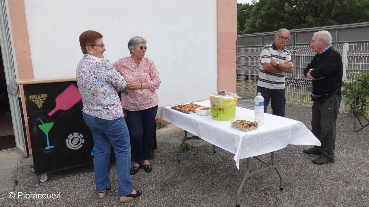 Une invasion de chenilles à la forêt de Bouconne, nous a fait changer de tactique pour notre repas champêtre annuel qui n'en était plus un, puisque nous avons pique-niqué salle du quai à Pibrac. L'apéritif s'est passé dehors sur la terrasse et le repas à l'intérieur pour déguster les préparations de chacun des adhérents. L'apéritif, et autres boissons, les saucisses et chorizos sont offerts par Pibraccueuil. Saucisses et chorizos, préparés à l'avance, et grillés par G. Delous .